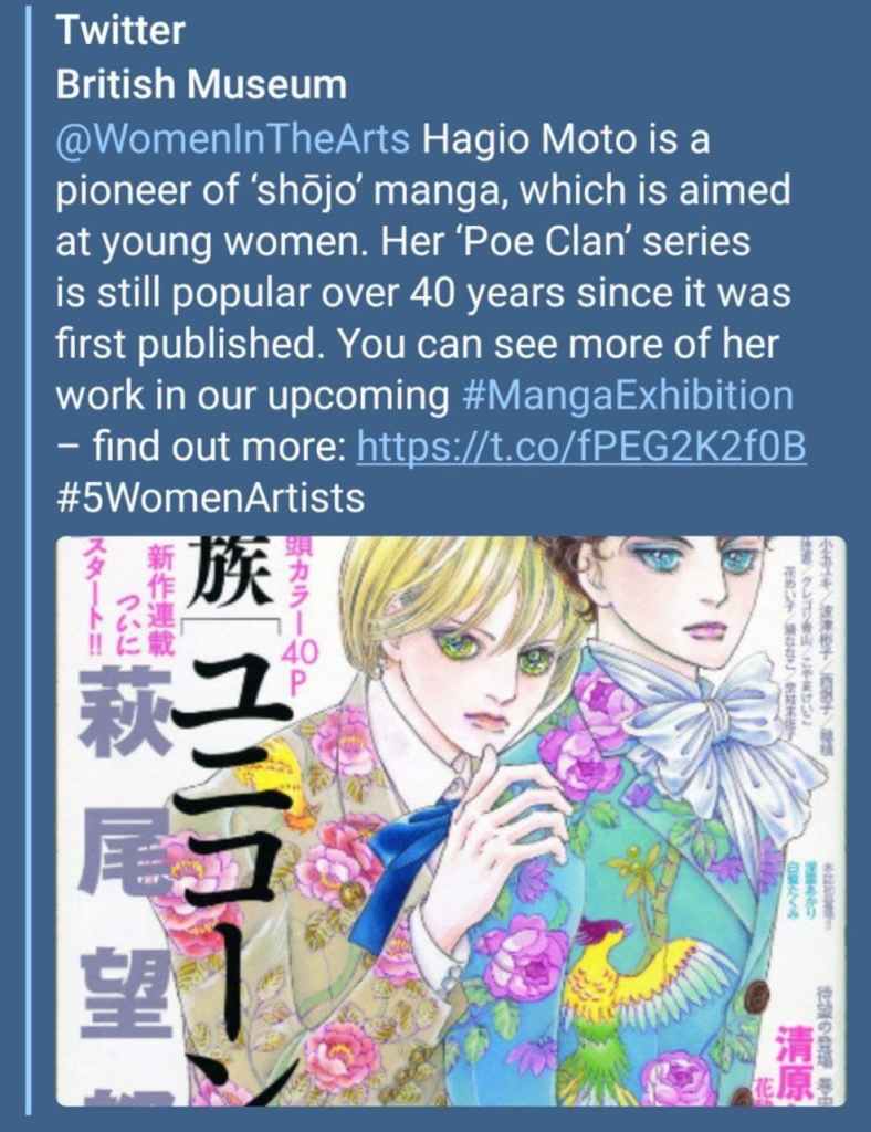 A Hagio se la conoce, junto a otras artistas del llamado grupo del 24, como una de las madres del shōjo. Este tipo de historias dirigidas a chicas jóvenes existían por supuesto desde mucho antes, pero estas mujeres cambiaron el género y le dieron la apariencia a la que lo asociamos en general hoy en día. Aunque no soy una gran fan de la separación de manga para chicas/manga para chicos creo que merece la pena pararse un poco en este tema al hablar de qué es el clan de los Poe.