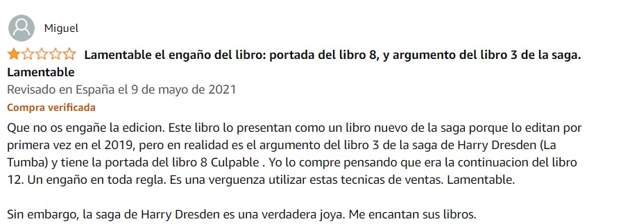 Pero esto no se termina aquí, no. La Factoría de Ideas, por motivos desconocidos para mí, cambió el orden de las portadas. En este libro aparece la portada de Proven Guilty, que es el octavo. Y ese, con el nombre de Culpable, llevó la portada de este (Grave Peril). Nosolorol, en cambio, mantuvo el orden original. Todo esto ha cristalizado en que su única reseña en Amazon, que les acusa de haber sacado el libro como novedad de manera confusa, ponga como argumento este supuesto cambio que en realidad era previo.